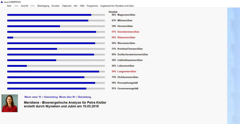 Das Aura-Programm zeigt bioenergetische Messwerte für die Aura, die Chakras und die Meridiane zwischen 0 und 100, wobei niedere Werte eine bioenergetische Unterladung und hohe Werte eine Überladung anzeigen. Werte unter 10% und über 90% erscheinen in Rot. Wenn Sie die Analyse wiederholen, erhalten Sie gleiche bzw. ähnliche Ergebnisse.