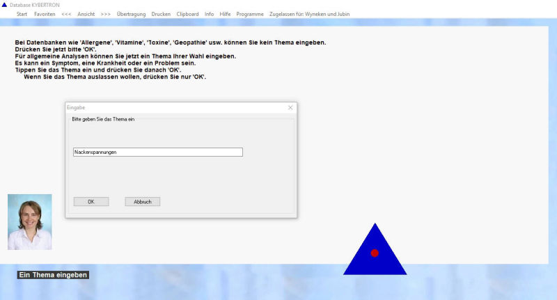 Beim Database-Programm geben Sie ein Thema (z.B. ein Symptom) ein und wählen Datenbanken aus. Beispiele: Ursachen, Meridianpunkte, toxische Stoffe, geopathische Belastungen, Körper, Psyche, Charakteranalyse, Störungsarten, Stressprofil, Firmenanalyse, verschiedene Mittel, Qualitäten und vieles mehr. Das Programm zeigt drei Ergebnisse aus der betreffenden Datenbank in der Reihenfolge der Relevanz an.