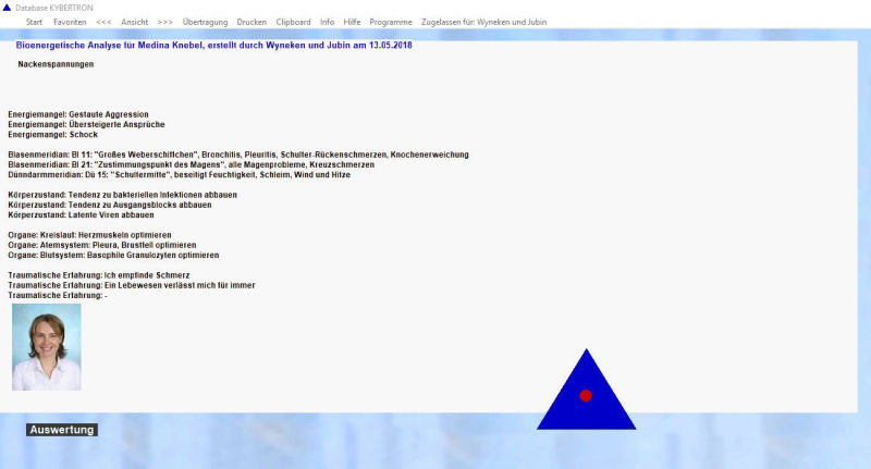 Die Auswertung können Sie drucken, über Word ausgeben, weiterverarbeiten und speichern. Schließlich können Sie auf Übertragung klicken und die in der Auswertung erstellten Inhalte balancieren. Sie können auch selbst neue Datenbanken erstellen. Damit können Sie das Kybertron Delta so einrichten, dass Ihr Spezialgebiet in die Analyse, die Auswertung und die Übertragung einbezogen wird.