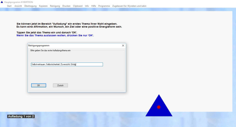 Beim Reinigungsprogramm geben Sie zuerst ein Entladungsthema Ihrer Wahl ein. Das kann ein Gift, eine allergische Reaktion, ein störendes Gefühl (”Kofschmerzen”, “Stress”), ein Glaubenssatz oder der Name einer Person sein, mit der Sie gerade Schwierigkeiten haben. Sie können auch ein zweites Entladungsthema einfügen.